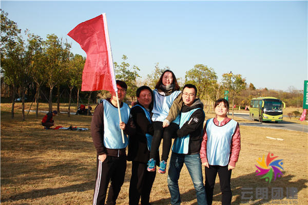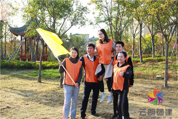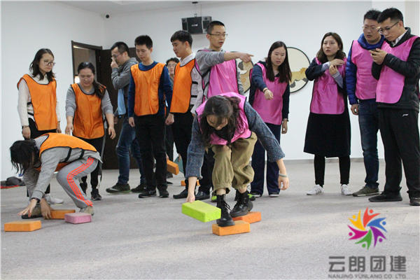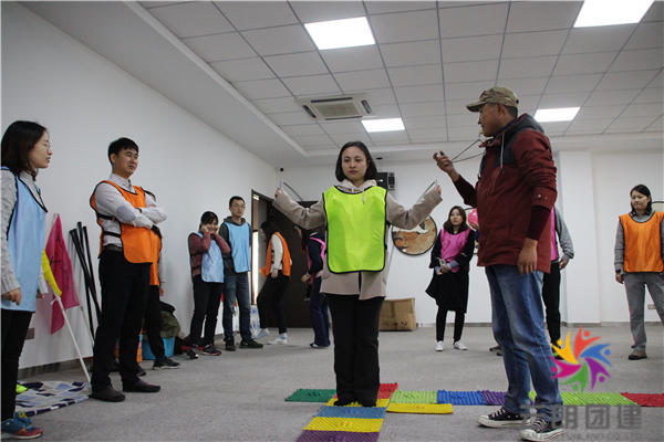 第二个人挑战的项目是摸石头过河,这个是个团队接力的项目。如何用仅有的三块道具,运输本队这么多队员到达彼岸。这需要团队的智慧,统一的标准和严格的执行才能做到。